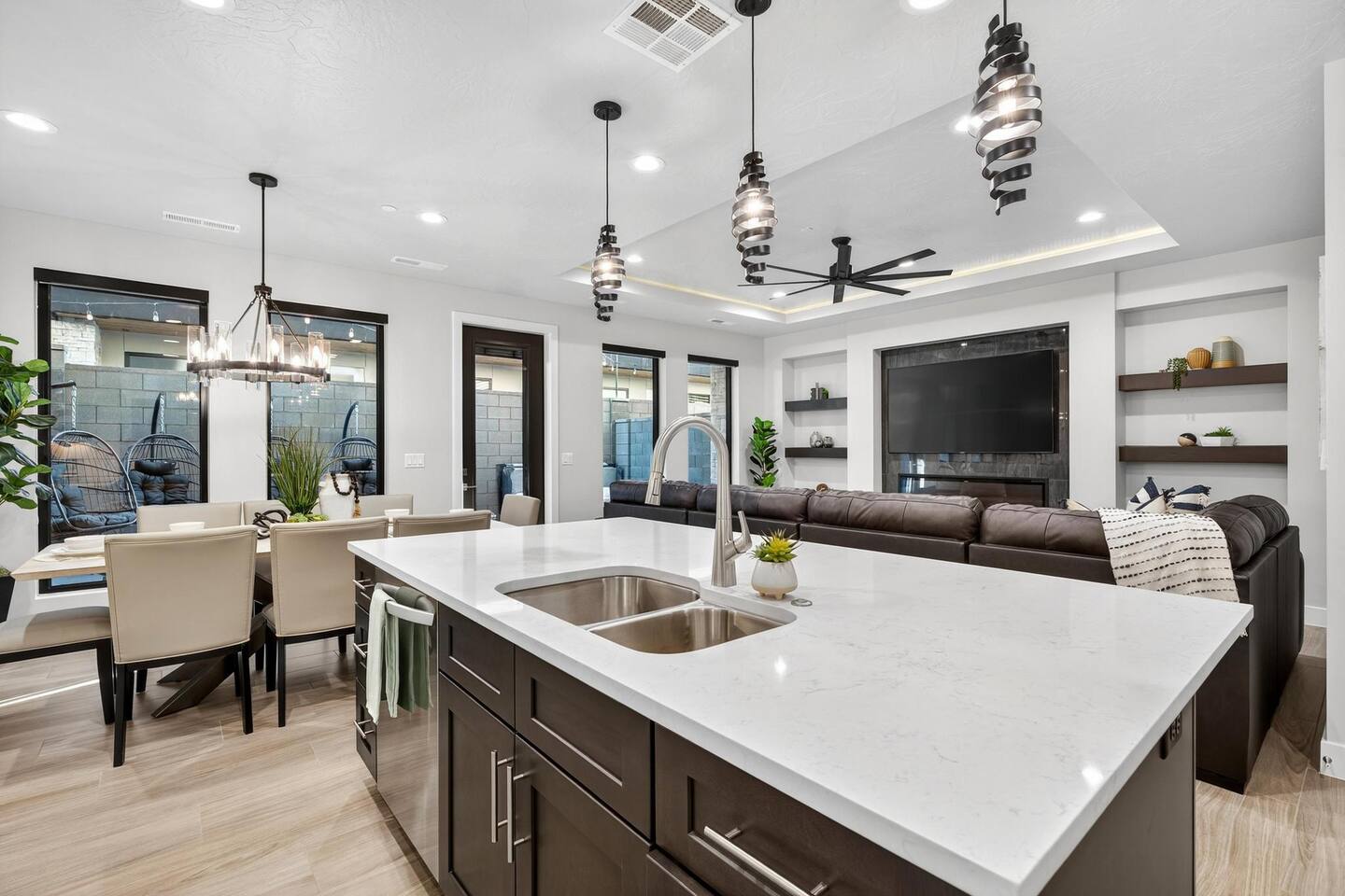 Unwind in your private hot tub or gather around the backyard fire pit for an unforgettable evening under the stars. With comfortable outdoor seating you'll have everything you need for relaxing evenings. Room Breakdown: Main Floor: Living Room, Kitchen, & Dining Area: An inviting open-concept space featuring a fully equipped kitchen, perfect for family meals. The expansive living area and dining space create the ideal setting for gatherings. Half Bath: Conveniently located for easy access on the main level. Upstairs: King Suite 1: A king-sized bedroom and a spacious en suite bathroom complete with a stand alone bath tub and walk-in shower. King Suite 2: Another luxurious king suite with a comfortable king-sized bed and its own en suite bathroom. Bunk Room: A perfect space with 4 queen-sized beds, accommodating up to 8 guests. Perfect for groups. This room also has a dedicated nearby bathroom. Loft: A cozy space for relaxation or play. Outdoor Amenities: Private Hot Tub & Fire Pit: Soak away your cares or share stories by the fire as you enjoy s’mores and starlit skies. Backyard Seating: Swinging egg chairs. 🌄 Adventure Ready Location On-site ATV Rentals with Club Rec. Sand Dunes & Golf - 5 minutes. Sand Hollow State Park – 5 minutes. Zion National Park – 30–45 minutes. Snow Canyon – 45 minutes. Bryce Canyon - 3 hrs. Downtown St. George – 30 minutes. Groceries & essentials – 10 minutes away (Times may vary depending on traffic.) 🌊 Resort Waterpark & Clubhouse Access – Included! Your stay includes 14 free daily passes to the resort’s private waterpark—just steps from your front door. Closed Tuesdays. Features include: 🌪️ Action River – Float or race around the current. 🛝 Waterslides for All Ages – Pure splashy fun. 🌊 Double Surf Air Machine – Try your balance on the wave! ⛳ Golf Simulators – Perfect your swing indoors anytime. (additional $35 per hour per group) 🏊 Huge Main Pool – Swim, splash, or chill. 🍹 Adults-Only Pool – A peaceful spot to relax kid-free. Need more than 12 passes? Guests can buy additional passes at the beach house for $35/person/day.