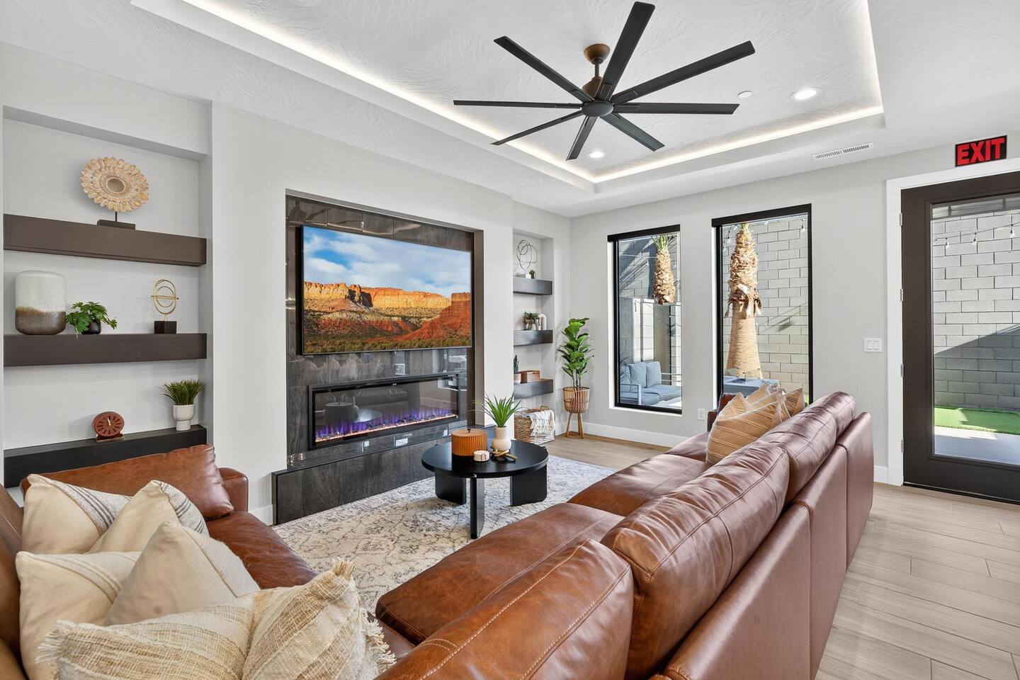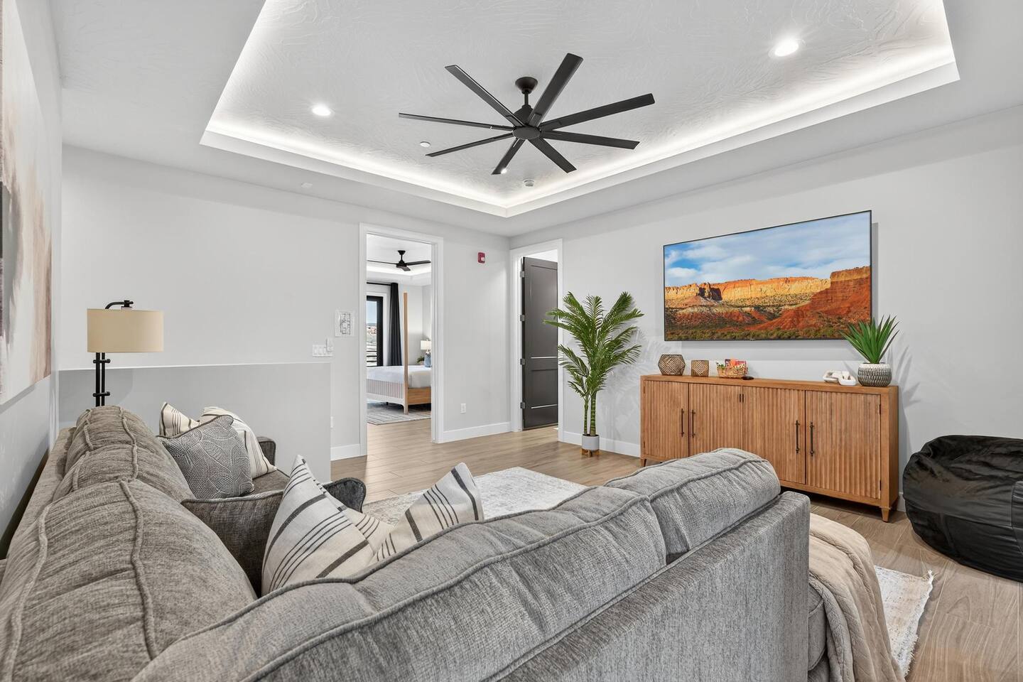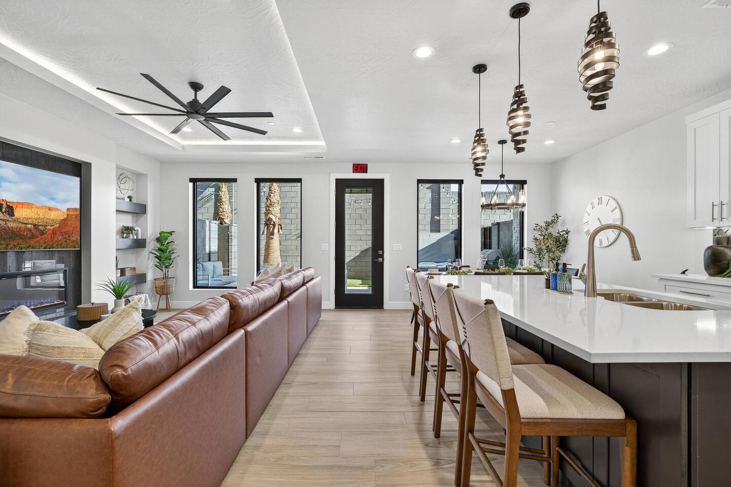 Main Floor – Open, Bright, & Functional The open layout creates a perfect space to cook, dine, and relax together. Garage Parking – Room for 2 cars or toys like ATVs. Driveway Parking – Space for extra vehicles. Fully Stocked Kitchen – High end appliances, cookware, and lots of counter space. Living Room – Plush seating, smart TV, and fireplace for cozy nights in. Dining Area – Large table for meals or games. Backyard Hangout – Soak in the hot tub, play mini golf, relax by the fire table. 🏜 Upstairs – Private & Peaceful ♔ Master Suite: Spacious & Serene King bed, smart TV, and a private balcony. The en suite bath has a walk-in shower with dual shower heads, soaking tub, and walk-in closet. ♕ Second Suite: Cozy & Comfortable King bed with attached bathroom (shower/tub combo)—a perfect retreat after a day out exploring. ♖ Bunk Room: Room for Everyone Four queen beds make this a fun and roomy spot for kids or groups. Built for both sleep and play. ♘ Loft Lounge A second hangout space with seating and a smart TV—great for movies or quiet time. 🌄 Adventure Ready Location On-site ATV Rentals with Club Rec Sand Dunes & Golf - 5 minutes Sand Hollow State Park – 5 minutes Zion National Park – 30–45 minutes Snow Canyon – 45 minutes Bryce Canyon - 3 hrs Downtown St. George – 30 minutes Groceries & essentials – 10 minutes away (Times may vary depending on traffic.) 🌊 Resort Waterpark & Clubhouse Access – Included! Your stay includes 12 free daily passes to the resort’s private waterpark—just steps from your front door. (Closed Tuesdays) Features include: 🌪️ Action River – Float or race around the current. 🛝 Waterslides for All Ages – Pure splashy fun. 🌊 Double Surf Air Machine – Try your balance on the wave! ⛳ Golf Simulators – Perfect your swing indoors anytime. (additional charge) 🏊 Huge Main Pool – Swim, splash, or chill. 🍹 Adults-Only Pool – A peaceful spot to relax kid-free. Need more than 12 passes? Guests can buy additional passes at the beach house for $35/person/day.