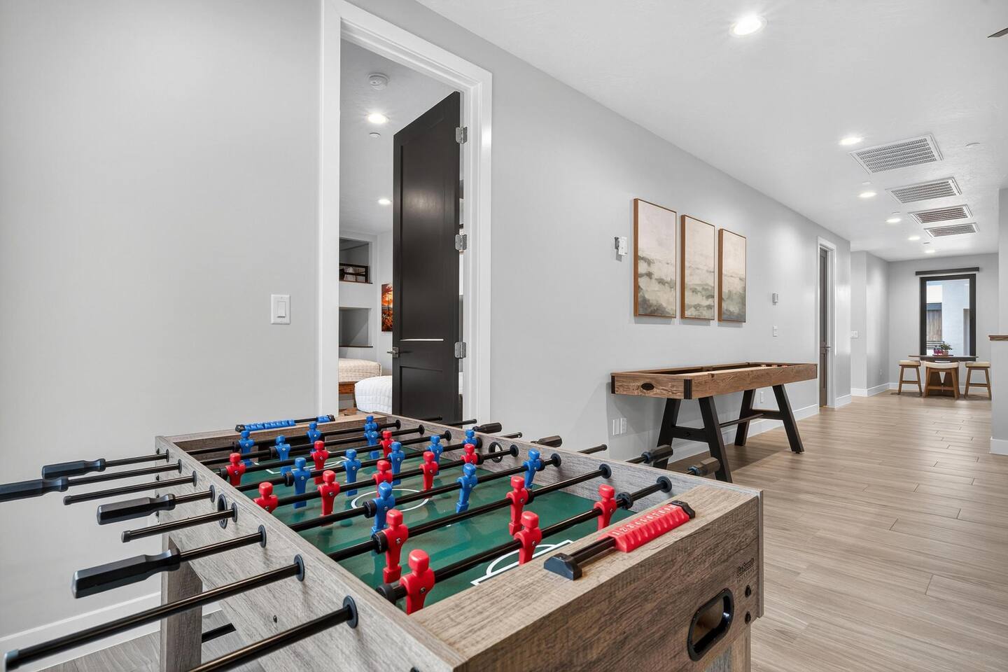 What You’ll Love 🌊 Private pool & spa combo 🛏️ 7 spacious bedrooms & 9 bathrooms — plenty of privacy for everyone 👩🍳 Chef’s kitchen with high-end appliances and generous prep space 🎮 Game room with 2 Nintendo Switch consoles, shuffleboard, air hockey, foosball, and board games 🎟️ 23 daily waterpark passes — enjoy slides, lazy river & surf simulator fun 📍 Prime location near Zion National Park, Sand Hollow, & Bryce Canyon Perfect for family reunions, multi-family vacations, retreats, or team getaways. Whether you’re exploring Southern Utah or lounging poolside, this home delivers the ultimate resort-style escape. Bedroom Configuration Main Level Bedroom 1 – King Suite A peaceful retreat featuring a king bed, private en suite bathroom, and direct access to the open living area and kitchen. Bedroom 2 – King Suite Elegant suite with a king bed, en suite bathroom. Half Bathroom Conveniently located off the main living area for guests. Laundry Room (Main Level) Full washer & dryer for your convenience. Second Level Bedroom 3 – Family Suite The ultimate family room with 3 queen beds and 5 twin built-in bunks in a stylish, high-end design—ideal for kids or larger families. Includes a private full bathroom. Bedroom 4 – King Suite Spacious suite with king bed, en suite bathroom, and private patio access. Bedroom 5 – King Suite Beautifully designed king suite with private bath and patio. Bedroom 6 – King Suite Modern and inviting, with king bed, full en suite, and ample natural light. Bedroom 7 – King Suite Tranquil retreat featuring king bed, private bath, and plenty of space to unwind. Laundry Room (Second Level) Washer and dryer for easy access during longer stays. Game Room & Entertainment Gather together for fun-filled nights in the fully equipped game room, featuring: 🎮 Two Nintendo Switch consoles 🃏 Card & board games for all ages 🏓 Shuffleboard, air hockey, and foosball tables Outdoor Amenities Private Pool & Spa – Heated and ready for use year-round Firepit & Outdoor Seating – Perfect for stargazing or late-night conversations BBQ Grill – Enjoy outdoor meals with family and friends Misting System – Keeps you cool and comfortable on warm Utah days Adventure-Ready Location On-site ATV rentals through Club Rec Sand Dunes & Golf: 5 minutes Sand Hollow State Park: 5 minutes Zion National Park: 30–45 minutes Snow Canyon: 45 minutes Bryce Canyon: 3 hours Downtown St. George: 30 minutes Groceries & essentials: 10 minutes (Times vary depending on traffic.) 🌊 Resort Waterpark & Clubhouse Access – Included! (Closed Tuesdays) Your stay includes 23 free daily passes to the resort’s private waterpark — just steps from your door! Waterpark Highlights 🌪️ Action River – Float or race around the current 🛝 Waterslides for all ages – Endless fun for kids and adults alike 🌊 Double Surf Air Machine – Test your balance on the wave ⛳ Golf Simulators – Perfect your swing indoors ($35/hour per group) 🏊 Main Resort Pool – Swim, splash, or soak in the sun 🍹 Adults-Only Pool – A peaceful, kid-free retreat Need extra passes? Additional day passes can be purchased at the Beach House for $35/person/day.