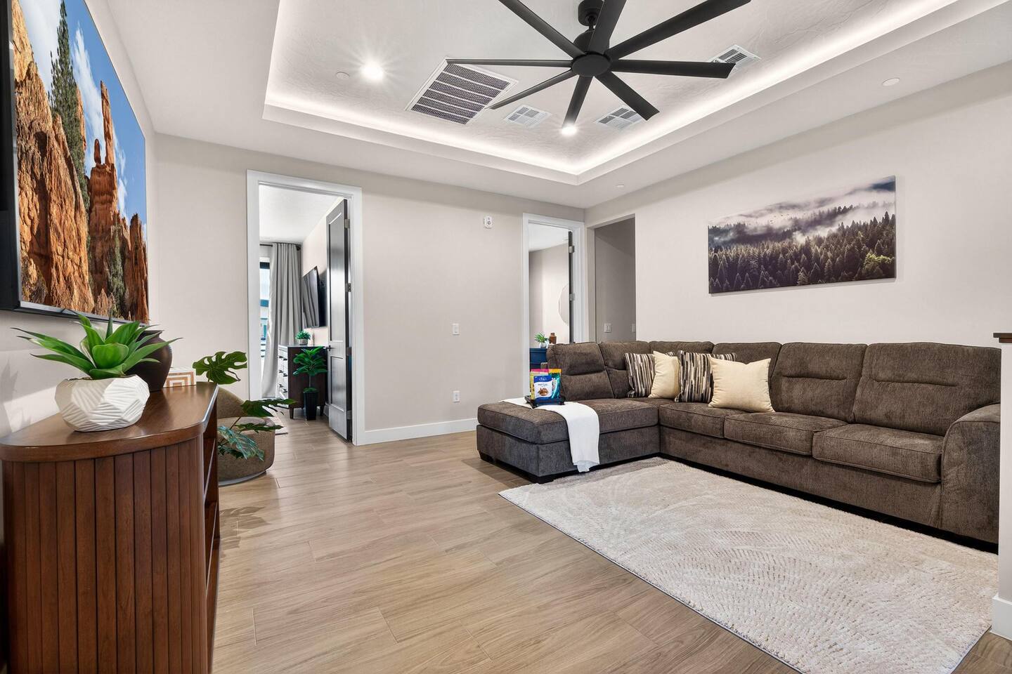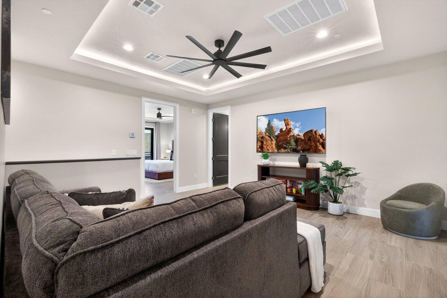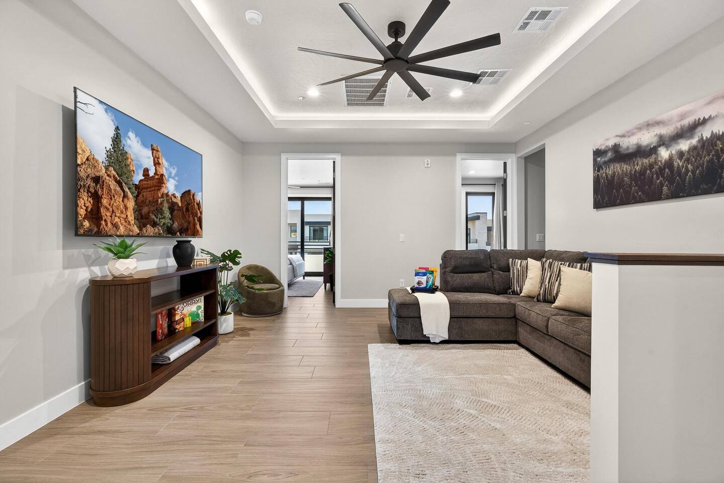 Unwind in your private hot tub or gather around the backyard fire pit for an unforgettable evening under the stars. With comfortable outdoor seating you'll have everything you need for relaxing evenings. Pecan Valley Resort Amenities – IMPORTANT NOTICE Please note that the Pecan Valley Resort waterpark and several amenities are currently limited and are expected to be fully available by the end of May. The resort itself remains open, and the following amenities are currently available: • Figure-8 hot tub • Surf machine (open daily from 12:00 PM – 3:00 PM) • Golf simulators ($20/hour per simulator) • On-site restaurant and bar (open Thursday–Sunday) Resort amenities, hours, and availability are managed directly by Pecan Valley Resort and may change based on weather, maintenance, or operational needs. By booking, guests acknowledge that waterpark access and certain amenities may be unavailable during this time. Refunds will not be issued based on amenity availability. Room Breakdown: Main Floor: Living Room, Kitchen, & Dining Area: An inviting open-concept space featuring a fully equipped kitchen, perfect for family meals. The expansive living area and dining space create the ideal setting for gatherings. Half Bath: Conveniently located for easy access on the main level. Upstairs: King Suite 1: A king-sized bedroom and a spacious en suite bathroom complete with a stand alone bath tub and walk-in shower. King Suite 2: Another luxurious king suite with a comfortable king-sized bed and its own en suite bathroom. Bunk Room: A perfect space with 4 queen-sized beds, accommodating up to 8 guests. Perfect for groups. This room also has a dedicated nearby bathroom. Loft: A cozy space for relaxation or play. Outdoor Amenities: Private Hot Tub & Fire Pit: Soak away your cares or share stories by the fire as you enjoy s’mores and starlit skies. Backyard Seating: Outdoor furniture with a cozy fire pit. 🌄 Adventure Ready Location On-site ATV Rentals with Club Rec. Sand Dunes & Golf - 5 minutes. Sand Hollow State Park – 5 minutes. Zion National Park – 30–45 minutes. Snow Canyon – 45 minutes. Bryce Canyon - 3 hrs. Downtown St. George – 30 minutes. Groceries & essentials – 10 minutes away (Times may vary depending on traffic.) 🌊 Resort Access Included! Your stay includes 12 free daily passes Features include: 🌪️ Action River – Float or race around the current. 🛝 Waterslides for All Ages – Pure splashy fun. 🌊 Double Surf Air Machine – Try your balance on the wave! ⛳ Golf Simulators – Perfect your swing indoors anytime. 🏊 Huge Main Pool – Swim, splash, or chill. 🍹 Adults-Only Pool – A peaceful spot to relax kid-free. Need more than 12 passes? Guests can buy additional passes at the beach house for $35/person/day.