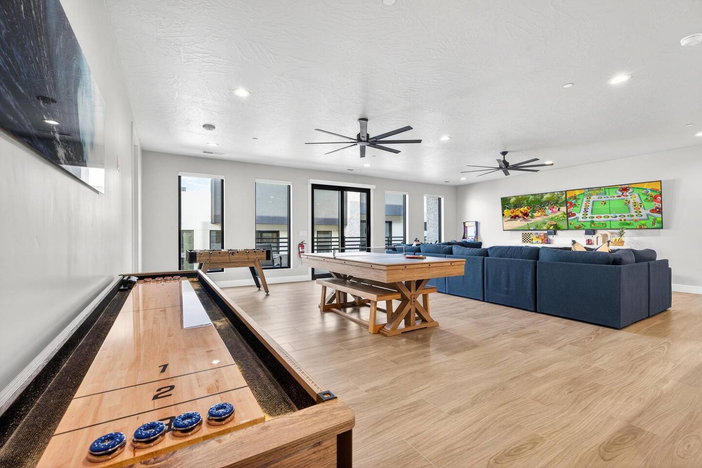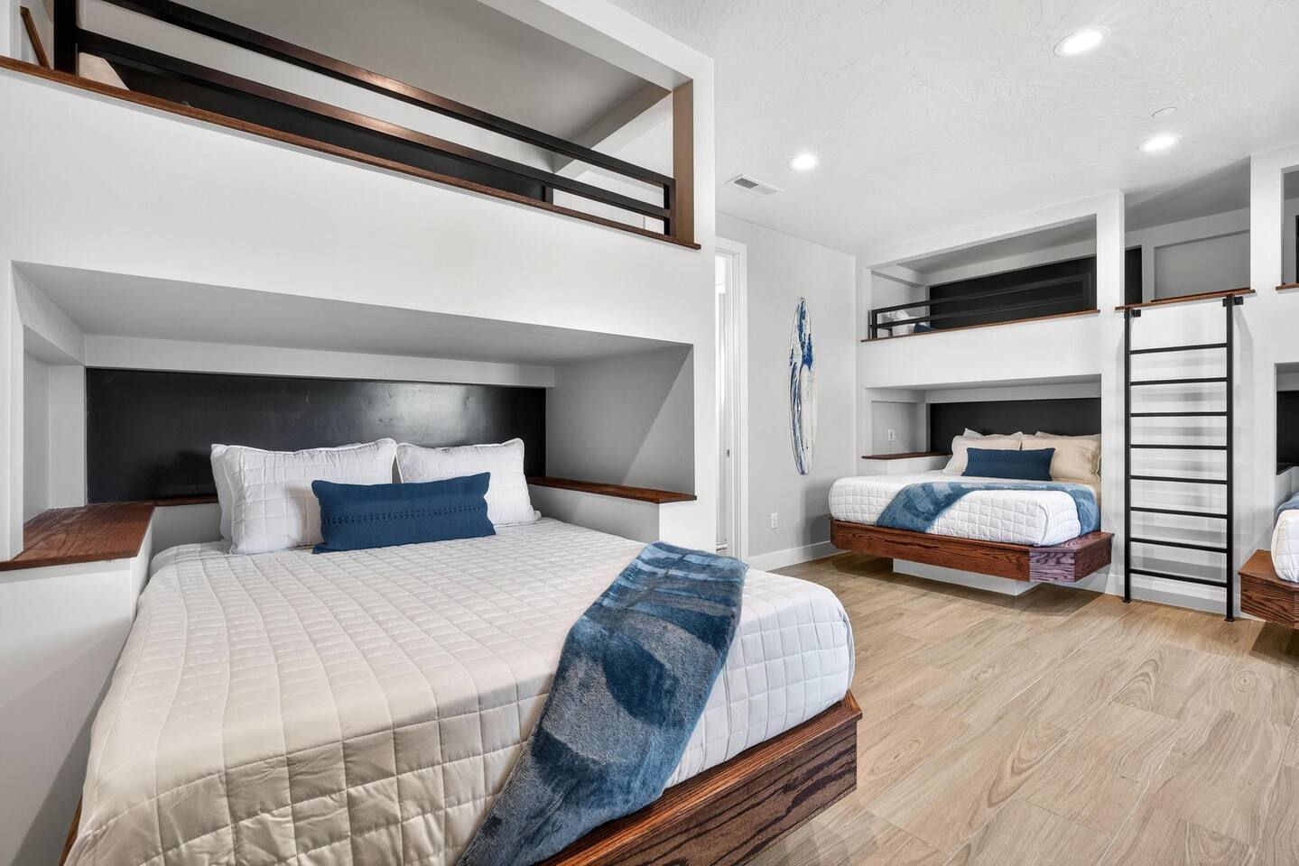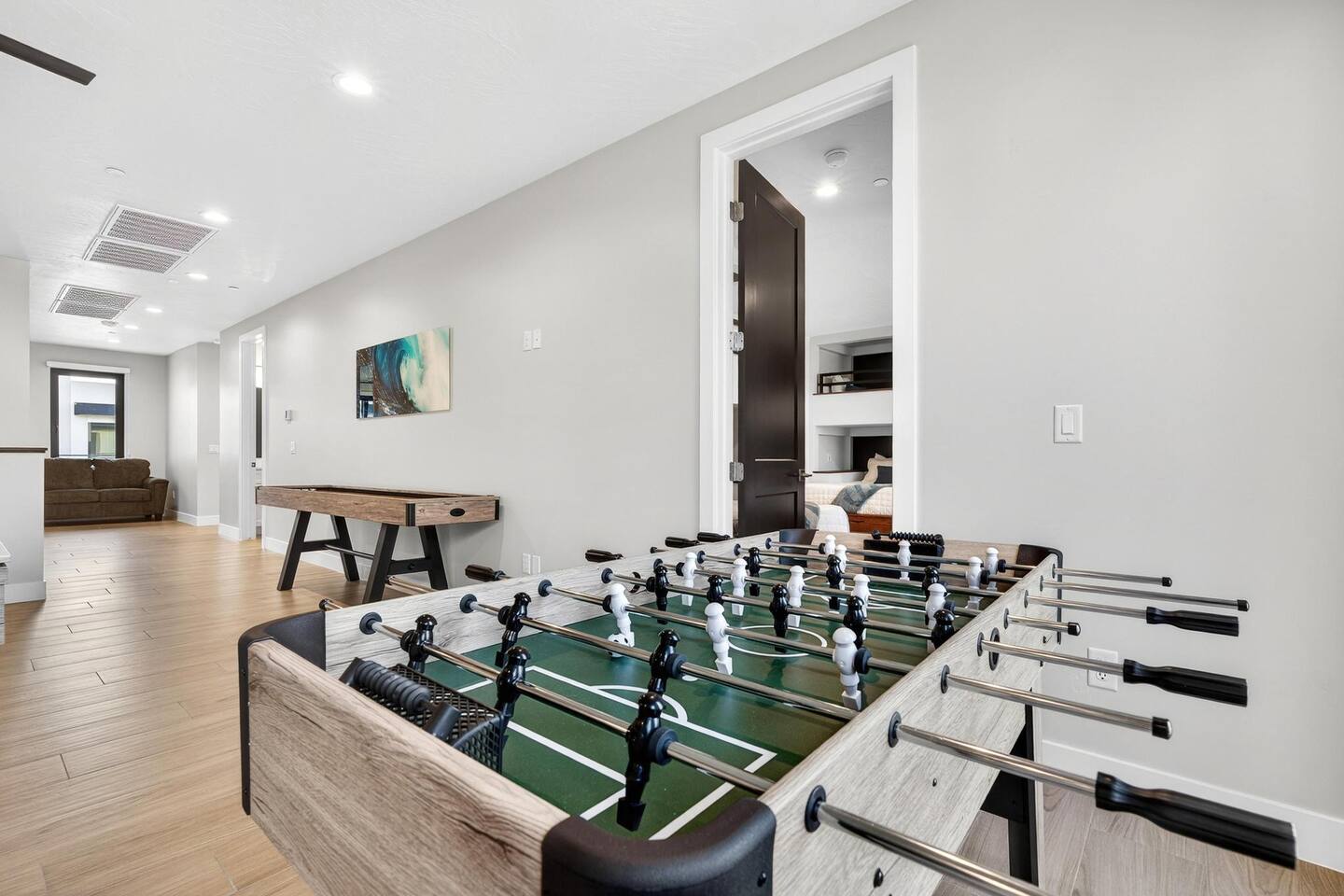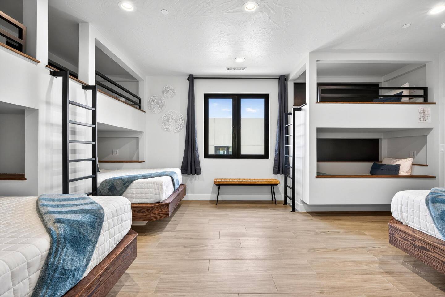Pecan Valley Resort Amenities – Important Notice Please note that the Pecan Valley Resort waterpark and several amenities are currently limited and are expected to be fully available by the end of May. The resort itself remains open, and the following amenities are currently available: • Figure-8 hot tub • Surf machine (open daily from 12:00 PM – 3:00 PM) • Golf simulators ($20/hour per simulator) • On-site restaurant and bar (open Thursday–Sunday) Resort amenities, hours, and availability are managed directly by Pecan Valley Resort and may change based on weather, maintenance, or operational needs. By booking, guests acknowledge that waterpark access and certain amenities may be unavailable during this time. Refunds will not be issued based on amenity availability. What You’ll Love 🌊 Private pool & spa combo (Spool) 🛏️ 7 spacious bedrooms & 9 bathrooms — plenty of privacy for everyone 👩🍳 Chef’s kitchen with high-end appliances and generous prep space 🎮 Game room 📍 Prime location near Zion National Park, Sand Hollow, & Bryce Canyon Perfect for family reunions, multi-family vacations, retreats, or team getaways. Whether you’re exploring Southern Utah or lounging poolside, this home delivers the ultimate resort-style escape. Bedroom Configuration Main Level Bedroom 1 – King Suite A peaceful retreat featuring a king bed, private en suite bathroom, and direct access to the open living area and kitchen. Bedroom 2 – King Suite Elegant suite with a king bed, en suite bathroom. Half Bathroom Conveniently located off the main living area for guests. Laundry Room (Main Level) Full washer & dryer for your convenience. Second Level Bedroom 3 – Family Suite The ultimate family room with 3 queen beds and 5 twin built-in bunks in a stylish, high-end design—ideal for kids or larger families. Includes a private full bathroom. Bedroom 4 – King Suite Spacious suite with king bed, en suite bathroom, and private patio access. Bedroom 5 – King Suite Beautifully designed king suite with private bath and patio. Bedroom 6 – King Suite Modern and inviting, with king bed, full en suite, and ample natural light. Bedroom 7 – King Suite Tranquil retreat featuring king bed, private bath, and plenty of space to unwind. Laundry Room (Second Level) Washer and dryer for easy access during longer stays. Game Room & Entertainment Gather together for fun-filled nights in the fully equipped game room, featuring: Outdoor Amenities Private Pool & Spa –(Spool- a two in one combo with no divider. Firepit & Outdoor Seating – Perfect for stargazing or late-night conversations BBQ Grill – Enjoy outdoor meals with family and friends Misting System – Keeps you cool and comfortable on warm Utah days (Winterized in cooler months) Adventure-Ready Location On-site ATV rentals through Club Rec Sand Dunes & Golf: 5 minutes Sand Hollow State Park: 5 minutes Zion National Park: 30–45 minutes Snow Canyon: 45 minutes Bryce Canyon: 3 hours Downtown St. George: 30 minutes Groceries & essentials: 10 minutes (Times vary depending on traffic.) 🌊 Resort Access Included! Your stay includes 23 free daily passes to the resort’s private waterpark — just steps from your door! Waterpark Highlights 🌪️ Action River – Float or race around the current 🛝 Waterslides for all ages – Endless fun for kids and adults alike 🌊 Double Surf Air Machine – Test your balance on the wave ⛳ Golf Simulators – Perfect your swing indoors ($35/hour per group) 🏊 Main Resort Pool – Swim, splash, or soak in the sun 🍹 Adults-Only Pool – A peaceful, kid-free retreat Need extra passes? Additional day passes can be purchased at the Beach House for $35/person/day.