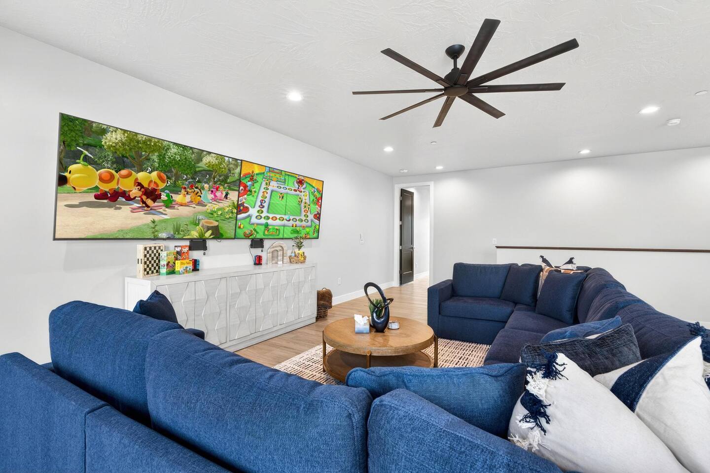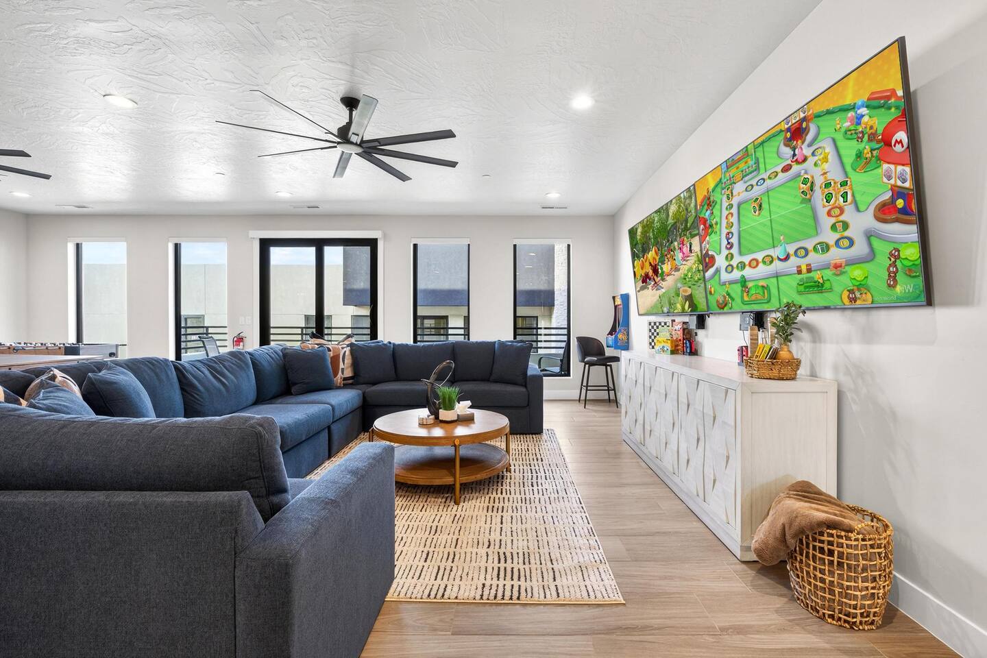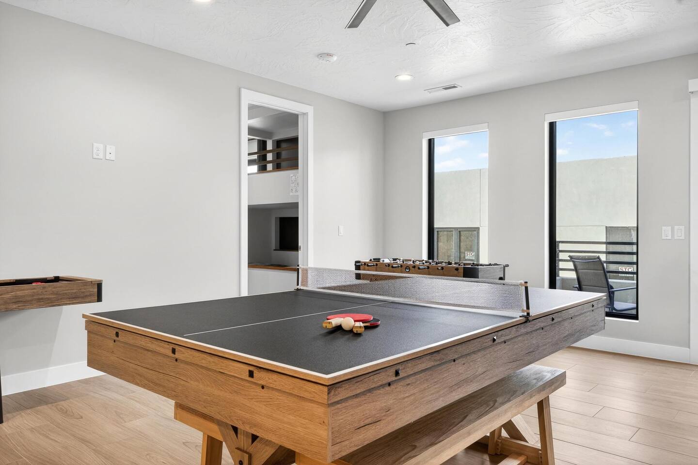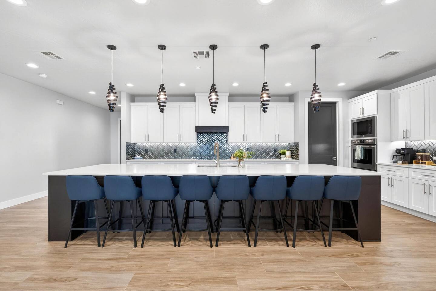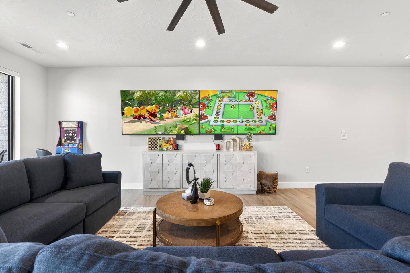 Pecan Valley Resort Amenities – Important Notice Please note that the Pecan Valley Resort waterpark and several amenities are currently limited and are expected to be fully available by the end of May. The resort itself remains open, and the following amenities are currently available: • Figure-8 hot tub • Surf machine (open daily from 12:00 PM – 3:00 PM) • Golf simulators ($20/hour per simulator) • On-site restaurant and bar (open Thursday–Sunday) Resort amenities, hours, and availability are managed directly by Pecan Valley Resort and may change based on weather, maintenance, or operational needs. By booking, guests acknowledge that waterpark access and certain amenities may be unavailable during this time. Refunds will not be issued based on amenity availability. What You’ll Love 🌊 Private pool & spa combo (Spool) 🛏️ 7 spacious bedrooms & 9 bathrooms — plenty of privacy for everyone 👩🍳 Chef’s kitchen with high-end appliances and generous prep space 🎮 Game room 📍 Prime location near Zion National Park, Sand Hollow, & Bryce Canyon Perfect for family reunions, multi-family vacations, retreats, or team getaways. Whether you’re exploring Southern Utah or lounging poolside, this home delivers the ultimate resort-style escape. Bedroom Configuration Main Level Bedroom 1 – King Suite A peaceful retreat featuring a king bed, private en suite bathroom, and direct access to the open living area and kitchen. Bedroom 2 – King Suite Elegant suite with a king bed, en suite bathroom. Half Bathroom Conveniently located off the main living area for guests. Laundry Room (Main Level) Full washer & dryer for your convenience. Second Level Bedroom 3 – Family Suite The ultimate family room with 3 queen beds and 5 twin built-in bunks in a stylish, high-end design—ideal for kids or larger families. Includes a private full bathroom. Bedroom 4 – King Suite Spacious suite with king bed, en suite bathroom, and private patio access. Bedroom 5 – King Suite Beautifully designed king suite with private bath and patio. Bedroom 6 – King Suite Modern and inviting, with king bed, full en suite, and ample natural light. Bedroom 7 – King Suite Tranquil retreat featuring king bed, private bath, and plenty of space to unwind. Laundry Room (Second Level) Washer and dryer for easy access during longer stays. Game Room & Entertainment Gather together for fun-filled nights in the fully equipped game room, featuring: Outdoor Amenities Private Pool & Spa –(Spool- a two in one combo with no divider. Firepit & Outdoor Seating – Perfect for stargazing or late-night conversations BBQ Grill – Enjoy outdoor meals with family and friends Misting System – Keeps you cool and comfortable on warm Utah days (Winterized in cooler months) Adventure-Ready Location On-site ATV rentals through Club Rec Sand Dunes & Golf: 5 minutes Sand Hollow State Park: 5 minutes Zion National Park: 30–45 minutes Snow Canyon: 45 minutes Bryce Canyon: 3 hours Downtown St. George: 30 minutes Groceries & essentials: 10 minutes (Times vary depending on traffic.) 🌊 Resort Access Included! Your stay includes 23 free daily passes to the resort’s private waterpark — just steps from your door! Waterpark Highlights 🌪️ Action River – Float or race around the current 🛝 Waterslides for all ages – Endless fun for kids and adults alike 🌊 Double Surf Air Machine – Test your balance on the wave ⛳ Golf Simulators – Perfect your swing indoors ($35/hour per group) 🏊 Main Resort Pool – Swim, splash, or soak in the sun 🍹 Adults-Only Pool – A peaceful, kid-free retreat Need extra passes? Additional day passes can be purchased at the Beach House for $35/person/day.