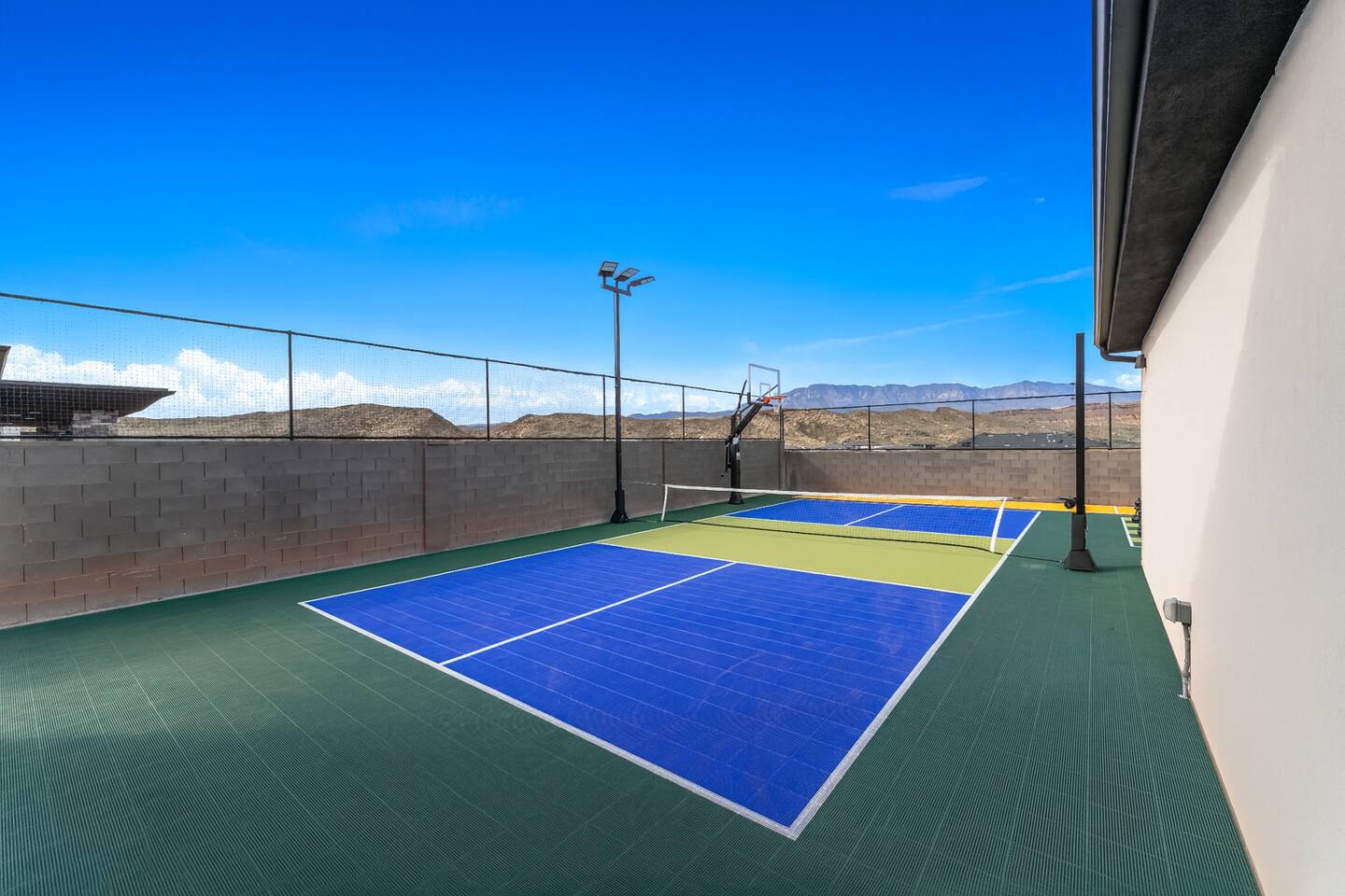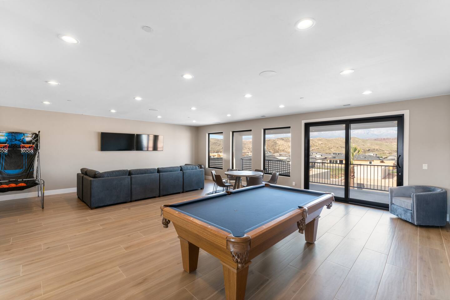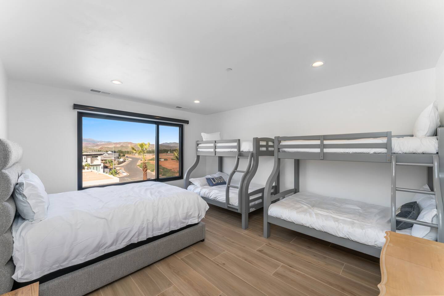 SPACIOUS Luxury Accommodations *Stretch out in your 5500+ sf open concept home on half-acre private resort setting *Sparkling clean & new with all the upgrades *3 spacious designer primary suites 2 family bedrooms w/ queen beds & bunks *6 full bathrooms *Gourmet kitchen fully stocked w/ all the cooking essentials *Oversized arcade room w/ ping pong, billiards, basketball, family games & Nintendo stations controllers for 12 players *Home theater w/ surround sound & beverage bar *Indoor/outdoor resort sound system *55” smart TVs in all bedrooms; Internet included *1 full washer/dryer set UNFORGETTABLE Outdoor Living & Fun Space *Full size private pool w/ hot tub spa, shamu shelf, pool volleyball & basketball; pool cover for safety *Private Sport Court for pickleball, basketball, volleyball … *Huge covered outdoor living space for barbequing, dining & entertainment; 70” TV, spray misters for cool summer relaxation, and fire pit for cozy warm winter gatherings *Oversized patio for events & spreading out w/ golf putting green, giant chess, tetherball, shuffleboard … PARKING & SECURITY *Super-sized 2-door garage & double deep RV garage for boat & toy storage *2 EV chargers *9 off-street parking spaces *Security system with cameras EXPLORE THE NEARBY NATURAL WONDERS & CULTURAL EVENTS! Ride your ATV directly from the property to Sand Hollow Trails in 10 minutes or drive to Zions NP in 45 minutes. Off street parking for 9 vehicles, so park the trailers once and go! *Minutes to all the St. George recreational attractions – Sand Hollow & Quail Creek reservoirs for boating, paddleboarding & water fun; unlimited offroad & ATV/motorbike adventures; sports, cycling, running events & U.S. Senior Olympics; Snow Canyon State Park *Nearby guided offroad tours and boat & UTV/ATV rentals *World class entertainment & culture – Tuacahn Amphitheater, Sand Hollow Rock Bowl *Short drive to Cedar City’s Brian Head Ski Resort, Shakespeare Festival & Utah Summer Games *Easy day trips to Bryce Canyon National Park, Grand Canyon North Rim, Lake Powell, Kanab & other must see natural wonders *Bedrooms Suite 1: King Bed Suite 2: Two queen beds Suite 3: Queen bed Family Room 1: Queen bed + 2 bunk bed sets with twin over double beds Family Room 2: Queen bed + 2 bunk bed sets with twin over double beds 🌊 Resort Waterpark & Clubhouse Access – Included! Your stay includes 12 free daily passes to the resort’s private waterpark—just a short walk away. Closed on Tuesdays. Features include: 🌪️ Action River – Float or race around the current. 🛝 Waterslides for All Ages – Pure splashy fun. 🌊 Double Surf Air Machine – Try your balance on the wave! ⛳ Golf Simulators – Perfect your swing indoors anytime. 🏊 Huge Main Pool – Swim, splash, or chill. 🍹 Adults-Only Pool – A peaceful spot to relax kid-free. Need more than 12 passes? Guests can buy additional passes at the beach house for $35/person/day.