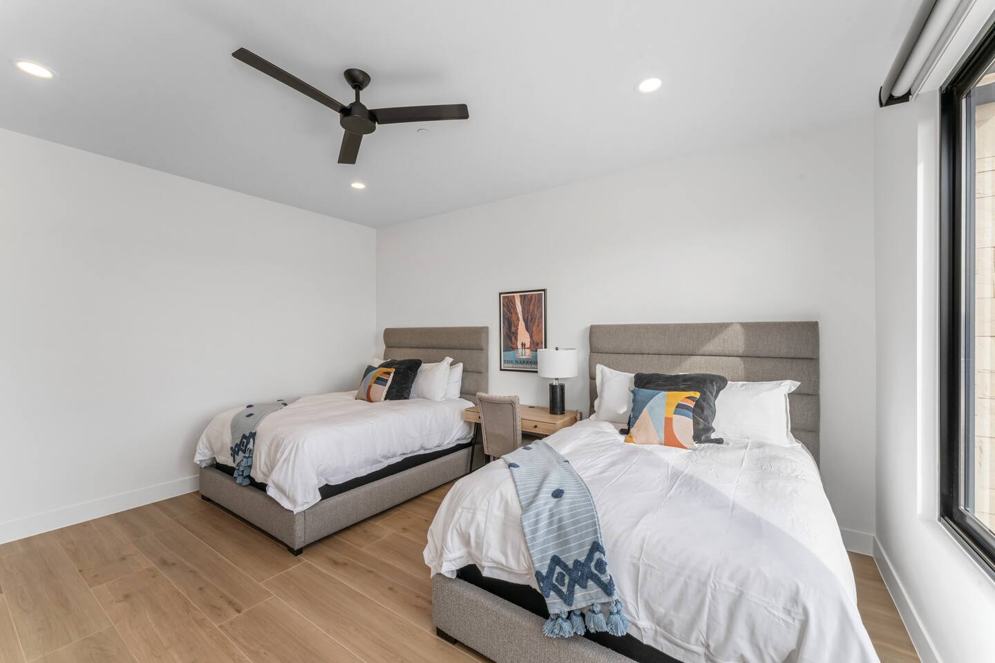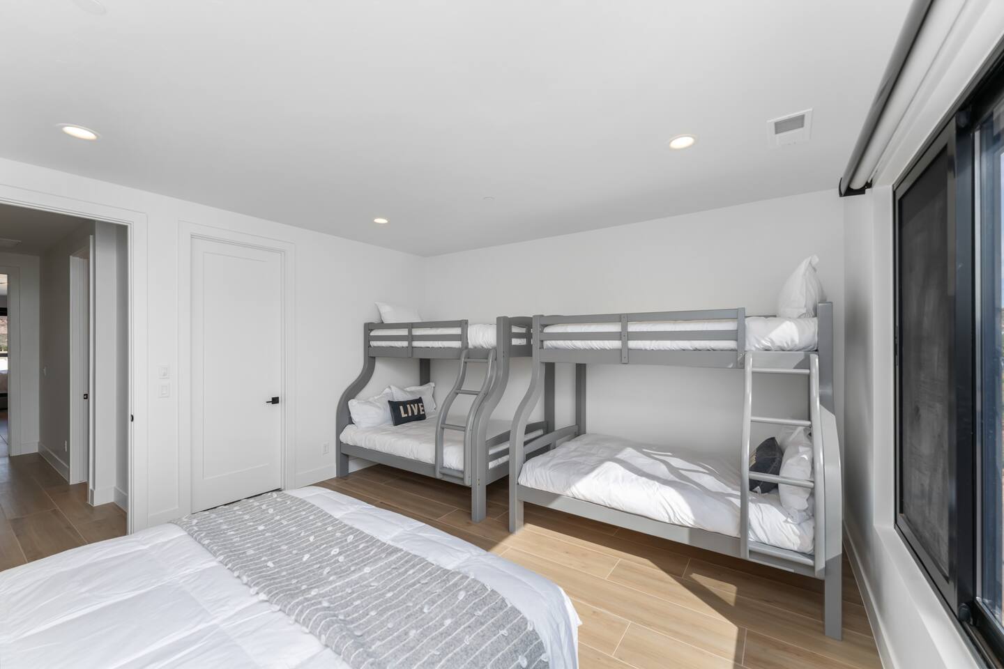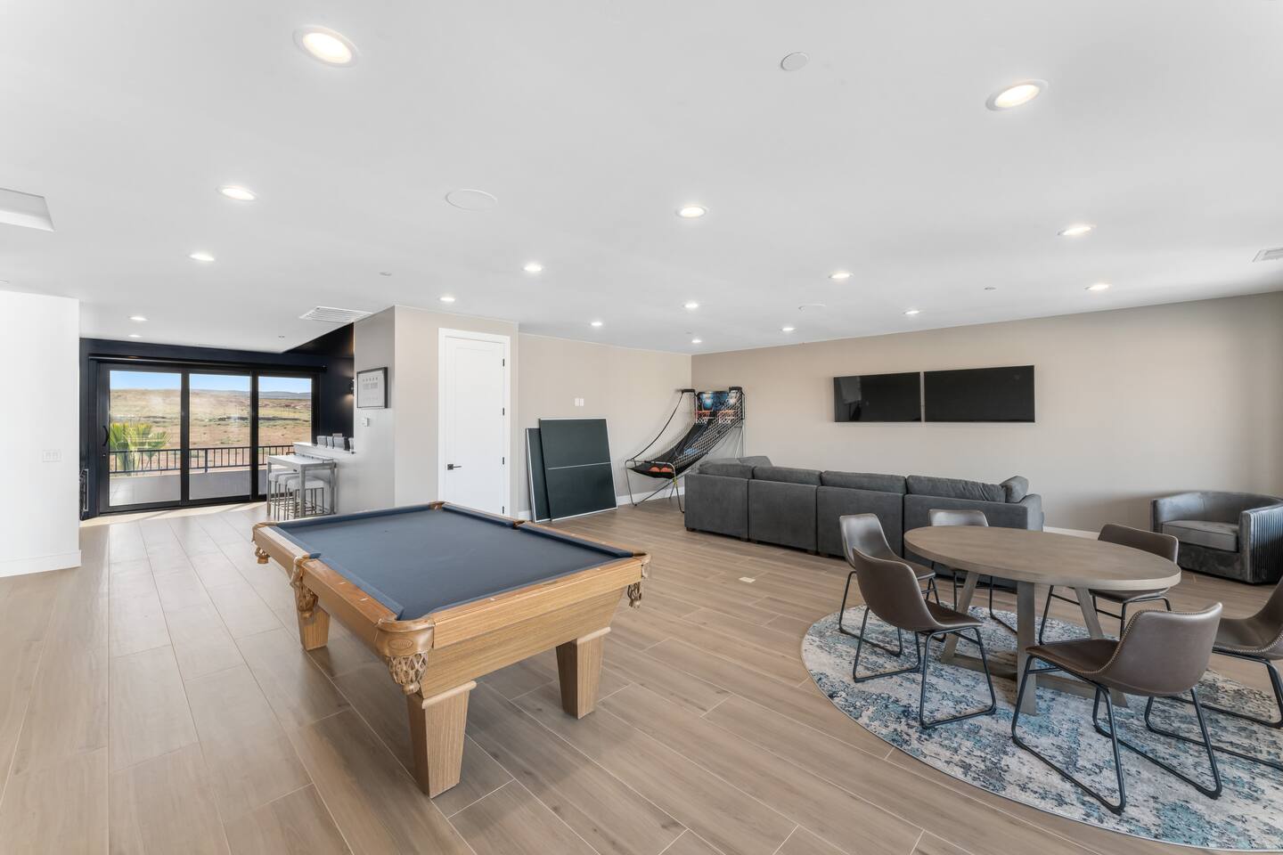SPACIOUS Luxury Accommodations *Stretch out in your 5500+ sf open concept home on half-acre private resort setting *Sparkling clean & new with all the upgrades *3 spacious designer primary suites 2 family bedrooms w/ queen beds & bunks *6 full bathrooms *Gourmet kitchen fully stocked w/ all the cooking essentials *Oversized arcade room w/ ping pong, billiards, basketball, family games & Nintendo stations controllers for 12 players *Home theater w/ surround sound & beverage bar *Indoor/outdoor resort sound system *55” smart TVs in all bedrooms; Internet included *1 full washer/dryer set UNFORGETTABLE Outdoor Living & Fun Space *Full size private pool w/ hot tub spa, shamu shelf, pool volleyball & basketball; pool cover for safety *Private Sport Court for pickleball, basketball, volleyball … *Huge covered outdoor living space for barbequing, dining & entertainment; 70” TV, spray misters for cool summer relaxation, and fire pit for cozy warm winter gatherings *Oversized patio for events & spreading out w/ golf putting green, giant chess, tetherball, shuffleboard … PARKING & SECURITY *Super-sized 2-door garage & double deep RV garage for boat & toy storage *2 EV chargers *9 off-street parking spaces *Security system with cameras EXPLORE THE NEARBY NATURAL WONDERS & CULTURAL EVENTS! Ride your ATV directly from the property to Sand Hollow Trails in 10 minutes or drive to Zions NP in 45 minutes. Off street parking for 9 vehicles, so park the trailers once and go! *Minutes to all the St. George recreational attractions – Sand Hollow & Quail Creek reservoirs for boating, paddleboarding & water fun; unlimited offroad & ATV/motorbike adventures; sports, cycling, running events & U.S. Senior Olympics; Snow Canyon State Park *Nearby guided offroad tours and boat & UTV/ATV rentals *World class entertainment & culture – Tuacahn Amphitheater, Sand Hollow Rock Bowl *Short drive to Cedar City’s Brian Head Ski Resort, Shakespeare Festival & Utah Summer Games *Easy day trips to Bryce Canyon National Park, Grand Canyon North Rim, Lake Powell, Kanab & other must see natural wonders *Bedrooms Suite 1: King Bed Suite 2: Two queen beds Suite 3: Queen bed Family Room 1: Queen bed + 2 bunk bed sets with twin over double beds Family Room 2: Queen bed + 2 bunk bed sets with twin over double beds 🌊 Resort Waterpark & Clubhouse Access – Included! Your stay includes 12 free daily passes to the resort’s private waterpark—just a short walk away. Closed on Tuesdays. Features include: 🌪️ Action River – Float or race around the current. 🛝 Waterslides for All Ages – Pure splashy fun. 🌊 Double Surf Air Machine – Try your balance on the wave! ⛳ Golf Simulators – Perfect your swing indoors anytime. 🏊 Huge Main Pool – Swim, splash, or chill. 🍹 Adults-Only Pool – A peaceful spot to relax kid-free. Need more than 12 passes? Guests can buy additional passes at the beach house for $35/person/day.