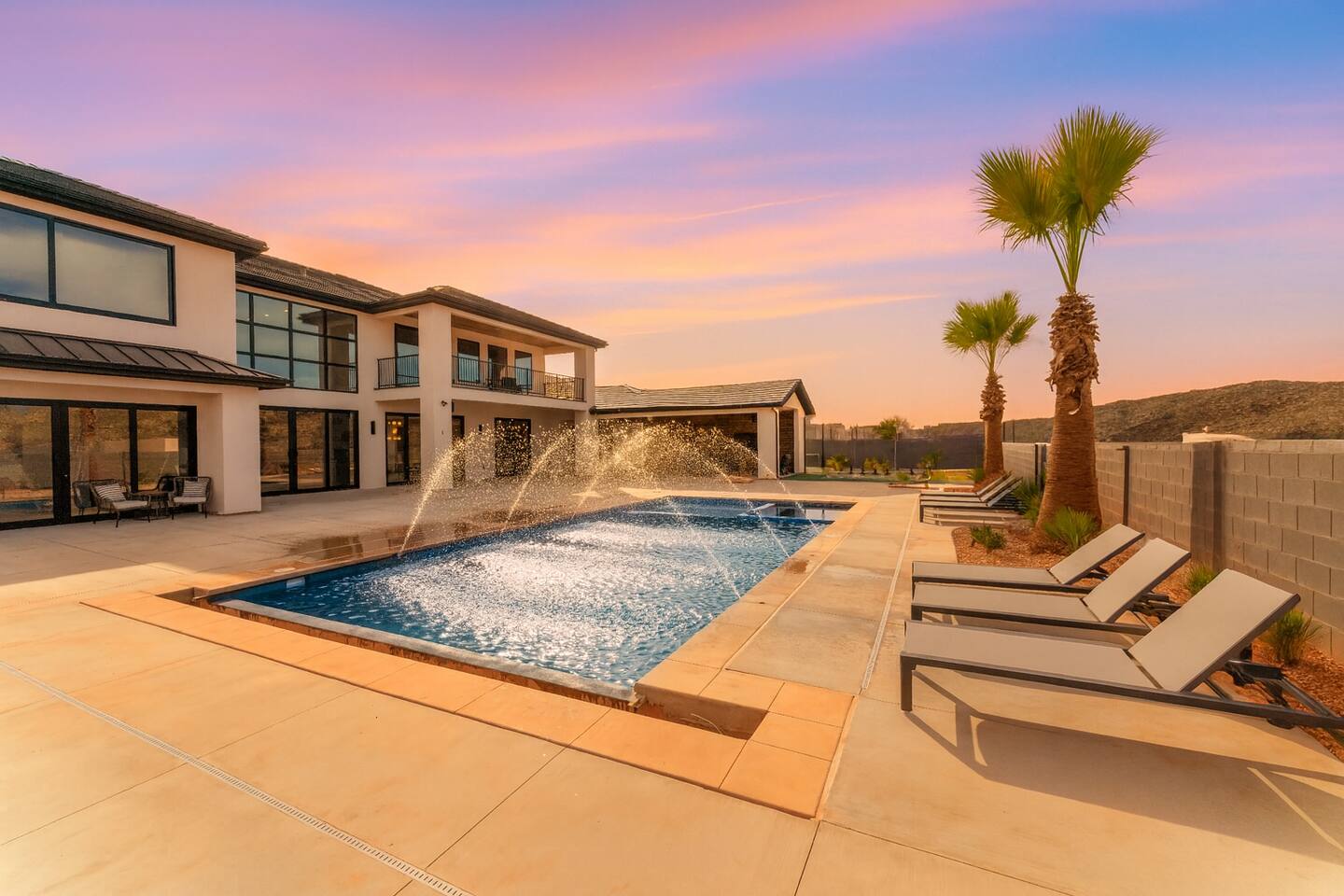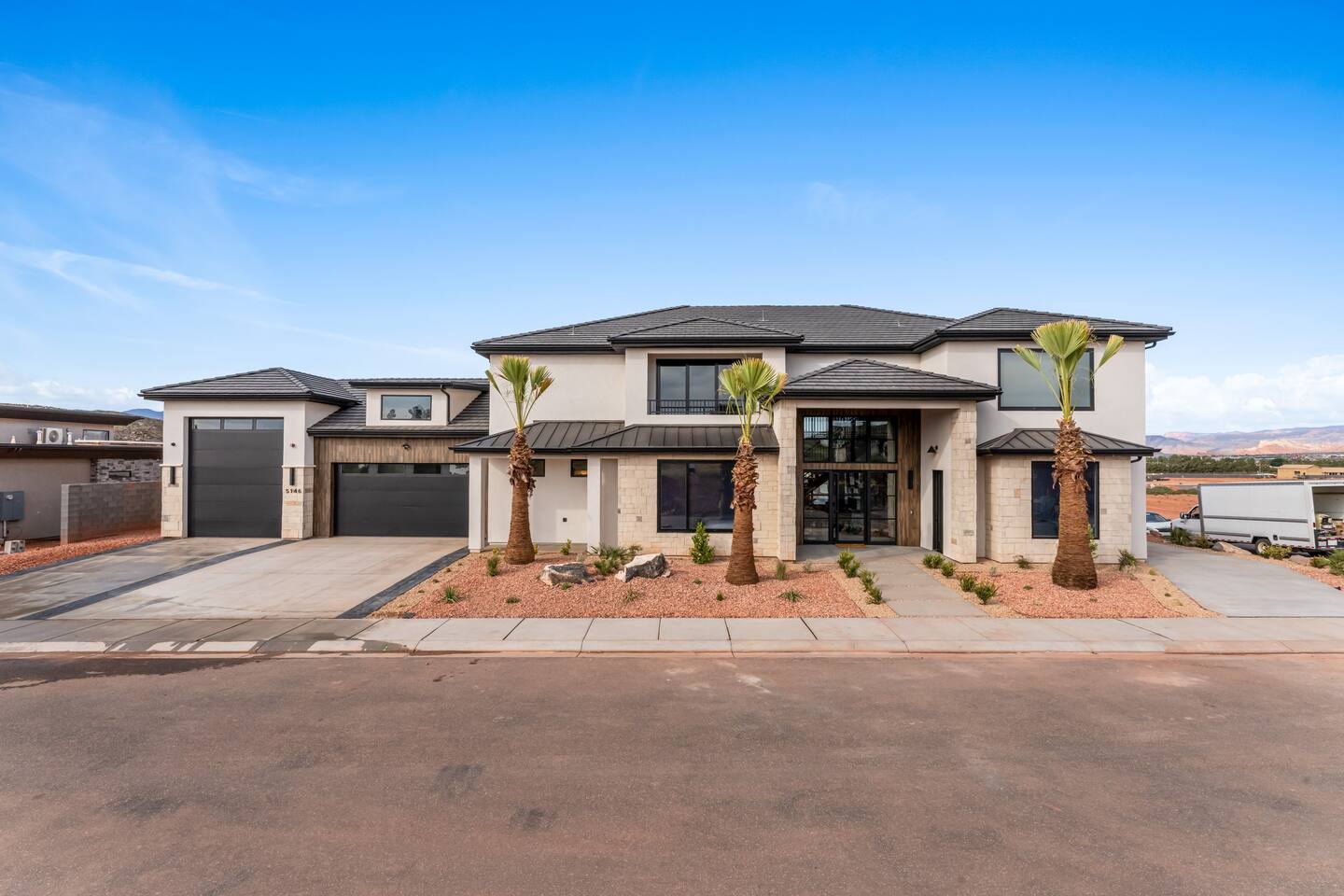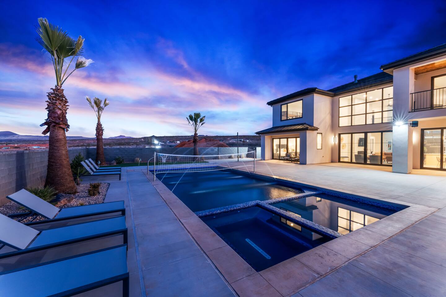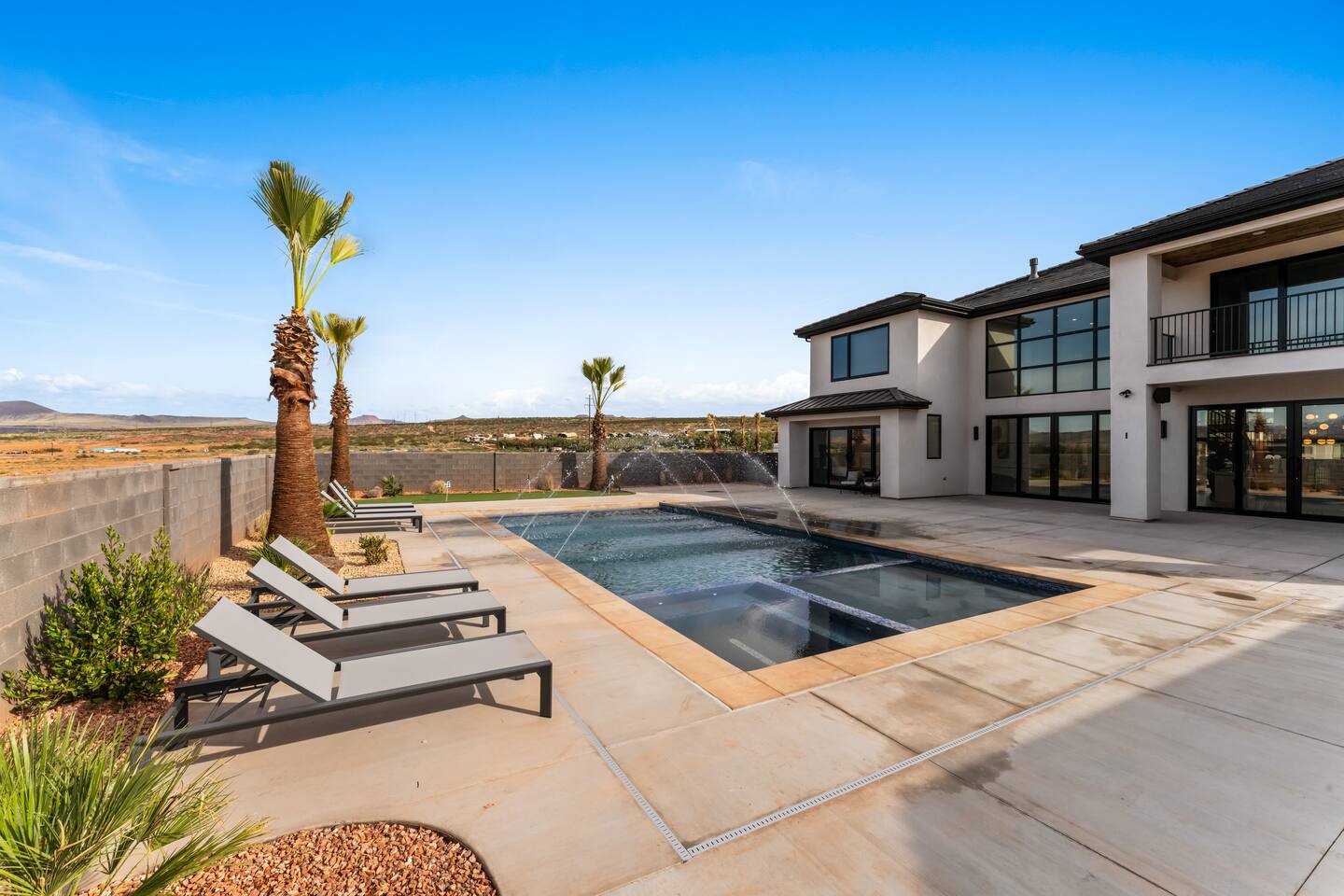 BRAND NEW Spacious Resort Home on Half-Acre with Full Privacy and ALL the Amenities! VERY COMFORTABLY SLEEPS UP TO 24. Designer Home Immersed in Palm Trees & Stunning Desert Vistas, Plush Pool, Outdoor Living & Sport Court. Spread Out, Relax & Indulge! Ride your ATV directly from the property to the Sand Hollow trails in 10 minutes or drive to Zions NP in 45 minutes. Off street parking for 9 vehicles, so park the trailers once and go.