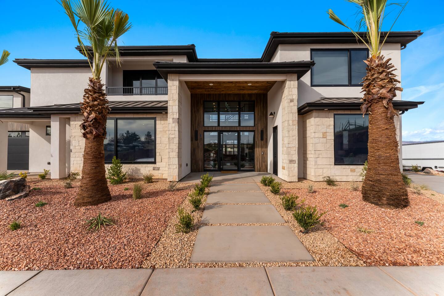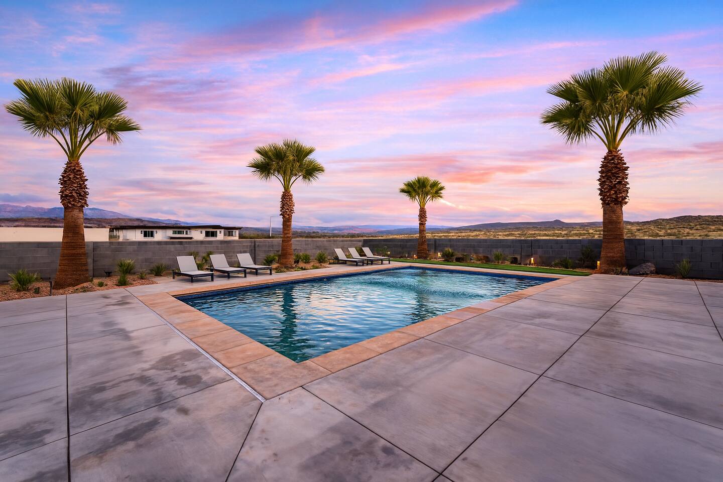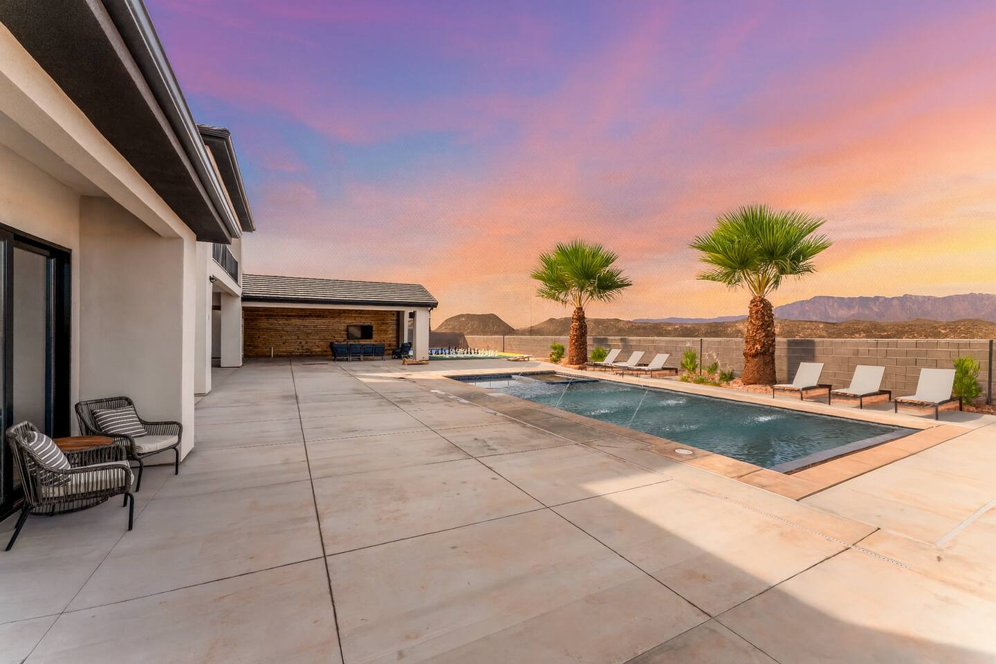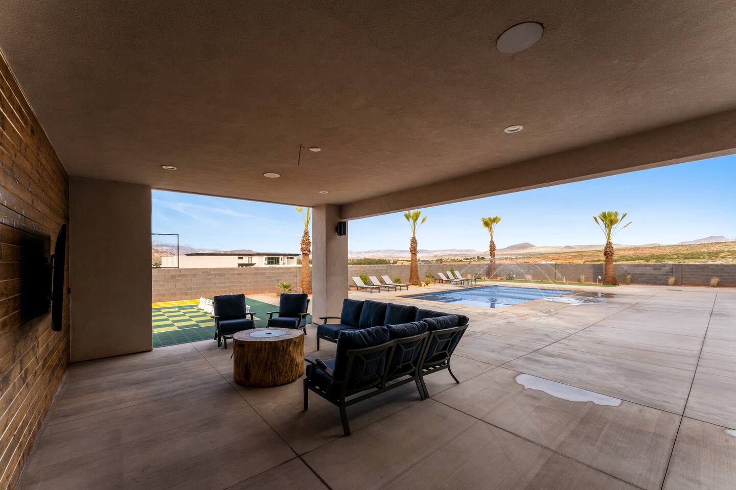 BRAND NEW Spacious Resort Home on Half-Acre with Full Privacy and ALL the Amenities! VERY COMFORTABLY SLEEPS UP TO 24. Designer Home Immersed in Palm Trees & Stunning Desert Vistas, Plush Pool, Outdoor Living & Sport Court. Spread Out, Relax & Indulge! Ride your ATV directly from the property to the Sand Hollow trails in 10 minutes or drive to Zions NP in 45 minutes. Off street parking for 9 vehicles, so park the trailers once and go.